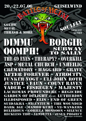 Musikalisch hat das Battle of Metal dieses Jahr ein exzellentes LineUp zu bieten, welches von Thrash bis Gothic alle Stile abdeckt. Gerockt wird auf der Mainstage sowie in der Eventhalle. Als Headliner wurden Dimmu Borgir und OOMPH! verpflichtet, weiterhin spielen Subway To Sally, Vader, Atrocity, Haggard, The 69 Eyes, Soulfly, Metal Church, Grave, Overkill, Crematory, Therapy?, Silence, Majesty, Faun, Justice, Gorilla Monsoon, Uli John Roth, Suidakra, Dark Age, Illdisposed, The Wounded, Regicide, Lacrimas Profundere, Silentium, Unheilig, Reckless Tide, Count Raven, Mambo Kurt, End of Green, Vendetta, Delirious, Jesus Project, Garden of Delight feat. Lutherion, Funker Vogt, After Forever, ASP und V8-Wankers.